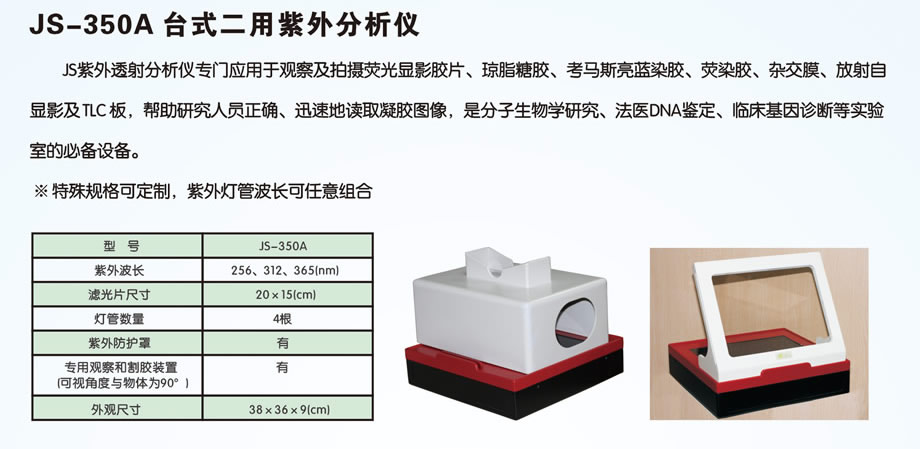 JS紫外透射分析儀專門應(yīng)用于觀察及拍攝熒光顯影膠片、瓊脂糖膠、考馬斯亮藍(lán)染膠、銀染膠、雜交膜、放射自顯影及TLC板,幫助研究人員正確、迅速地讀取凝膠圖像,是分子生物學(xué)研究、法醫(yī)DNA鑒定、臨床基因診斷等實(shí)驗(yàn)室的所備設(shè)備。